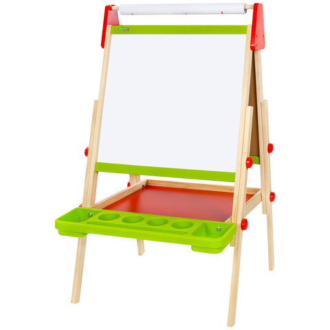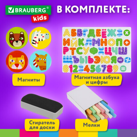 | Комплектация | бумага для рисования, держатель бумаги для рисования, магниты, набор цифр, знаков и букв, полка для принадлежностей, стиратель, цветные мелки |