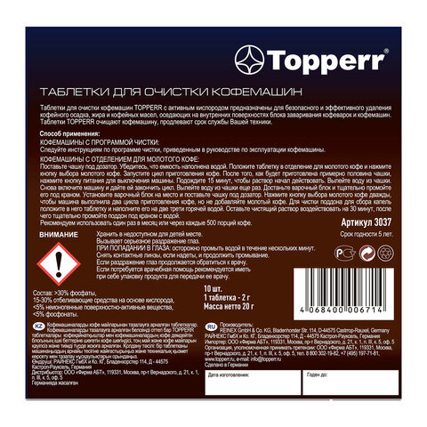Таблетки TOPPERR для очистки кофемашин от масел с активным кислородом предназначены для безопасного и эффективного удаления кофейного осадка, жира и кофейных масел, оседающих на внутренних поверхностях блока заваривания кофеварок и кофемашин.