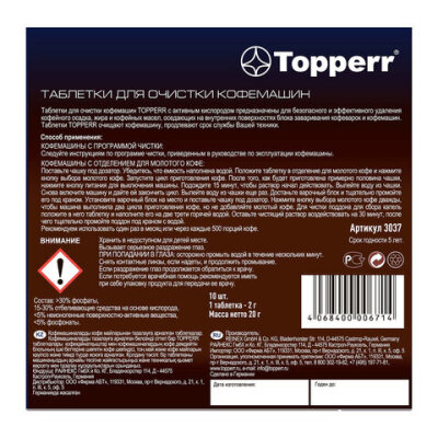 Таблетки для очистки кофемашин от эфирных масел TOPPERR, КОМПЛЕКТ 10 шт., 3037