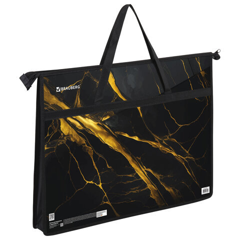 Папка для рисунков и чертежей с ручками BRAUBERG А3, пластик, молния сверху, "Black&gold marble", 272232