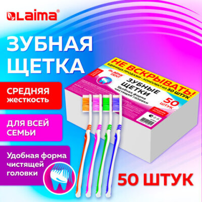 Зубная щетка средней жесткости (ассорти 4 цвета), КОМПЛЕКТ 50 шт., LAIMA DENT, 609691