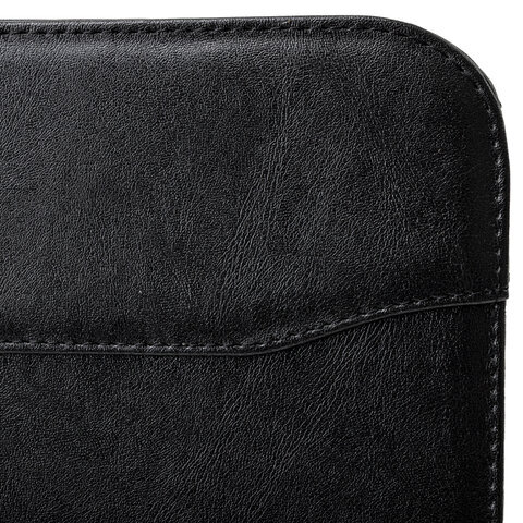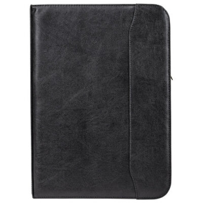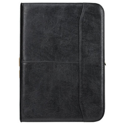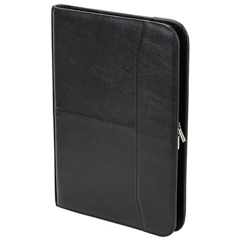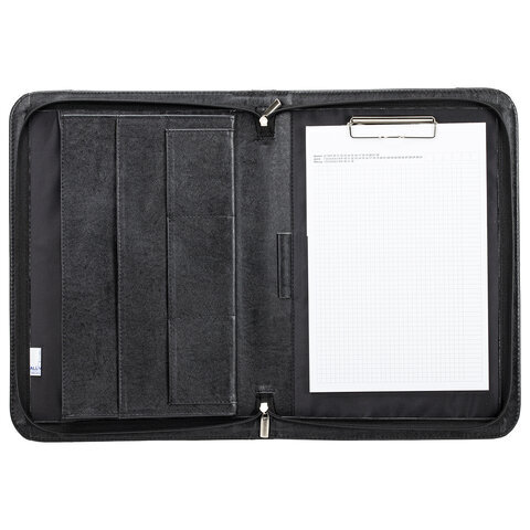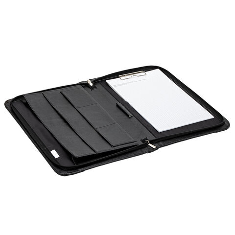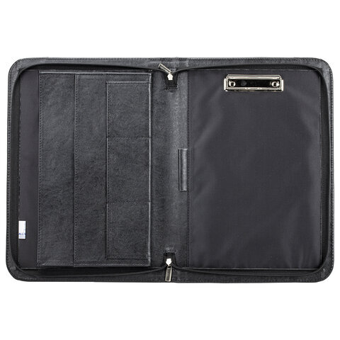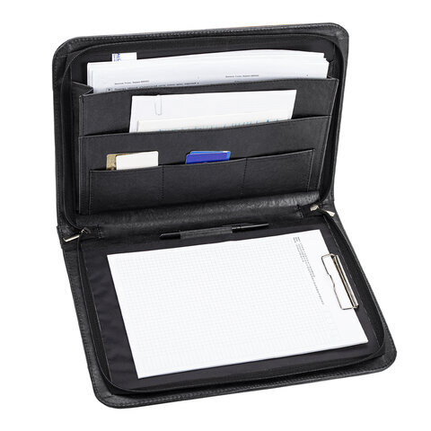 • Распашная деловая папка на молнии. Состоит из двух больших карманов для документов. Снабжена металлическим прижимом для бумаг. Дополнительные отделения для визиток и пр.