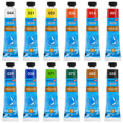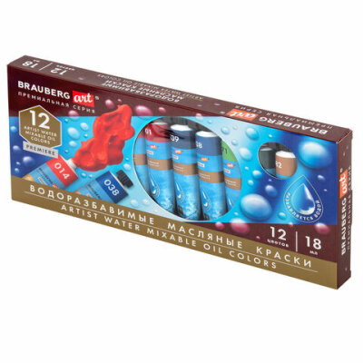 Краски масляные ВОДОРАЗБАВИМЫЕ художественные, 12 цветов по 18 мл в тубах, BRAUBERG ART PREMIERE, 192290