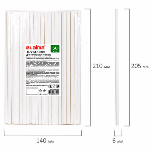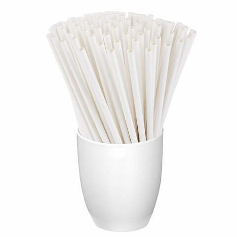Трубочки для коктейлей бумажные, прямые, 6х205 мм, белые, комплект 50 штук, LAIMA, 608366