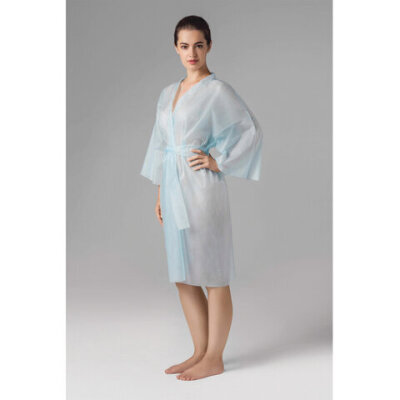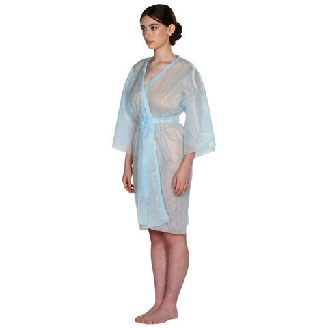 Халаты-кимоно с рукавами ЧИСТОВЬЕ изготовлены из голубого нетканого материала СМС плотностью 20 г/м2 и упакованы по 5 штук.