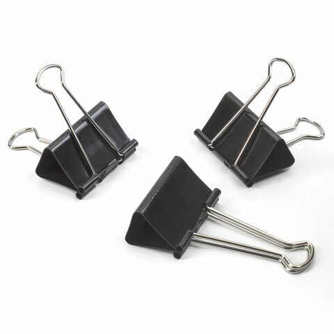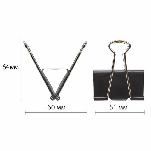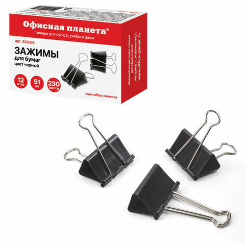 Зажимы для бумаг ОФИСНАЯ ПЛАНЕТА,КОМПЛЕКТ 12 шт., 51 мм, на 230 листов, черные, картонная коробка, 222002