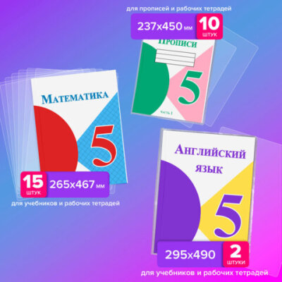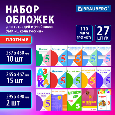 Обложки ПВХ для учебников и тетрадей, НАБОР 27 шт., ПЛОТНЫЕ, 110 мкм, универсальные, прозрачные, BRAUBERG, 272705