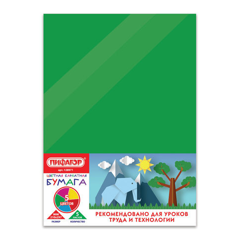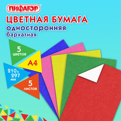 Цветная бумага А4 БАРХАТНАЯ, 5 листов 5 цветов, 110 г/м2, ПИФАГОР, 128971