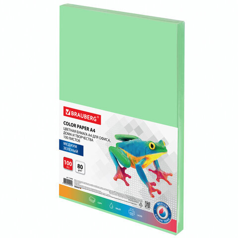 Бумага цветная BRAUBERG, А4, 80 г/м2, 100 л., медиум, зеленая, для офисной техники, 112458