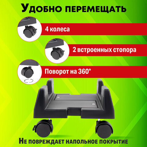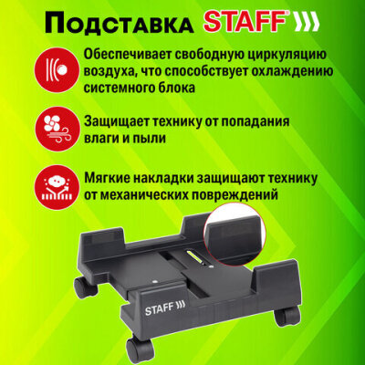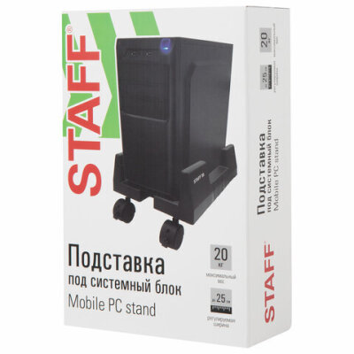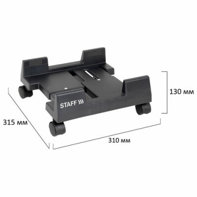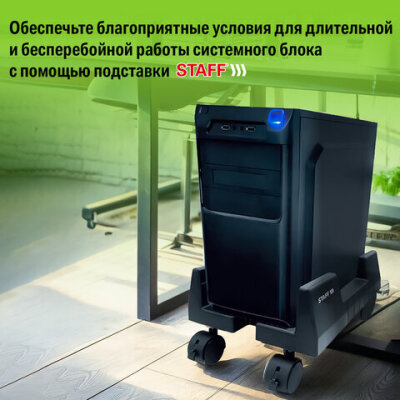 Передвижная подставка для системного блока STAFF. Мобильность подставки позволяет передвигать системный блок компьютера без усилий, не повреждая напольное покрытие. Благодаря этому появляется возможность производить более тщательную уборку рабочего места.