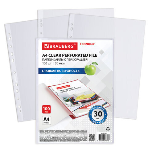 Папки-файлы перфорированные А4 BRAUBERG "ECONOMY", КОМПЛЕКТ 100 шт., гладкие, 30 мкм, 229659