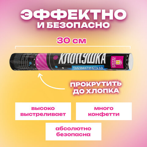 Пневматическая хлопушка не является пиротехникой и работает на основе энергии сжатого воздуха. Конфетти и серпантин ярких цветов можно использовать в помещении или на улице. Хлопушка подойдет для праздников, концертов, реквизита для фотосессии.