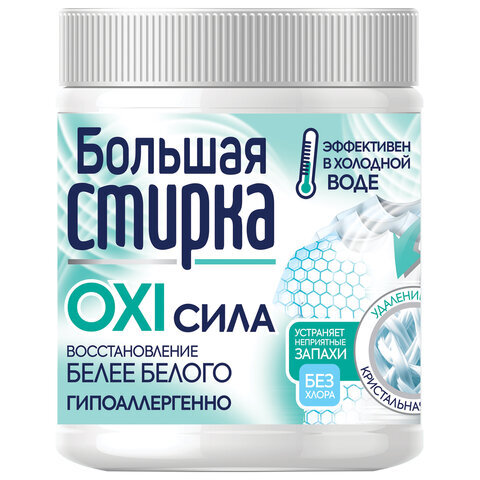 Кислородный пятновыводитель-отбеливатель БОЛЬШАЯ СТИРКА эффективно удаляет пятна и и неприятные запахи. Обладает антимикробным действием. Придает вещам кристальную белизну. Безопасен для всех типов тканей. Эффективны даже в холодной воде. Гипоалергенный.