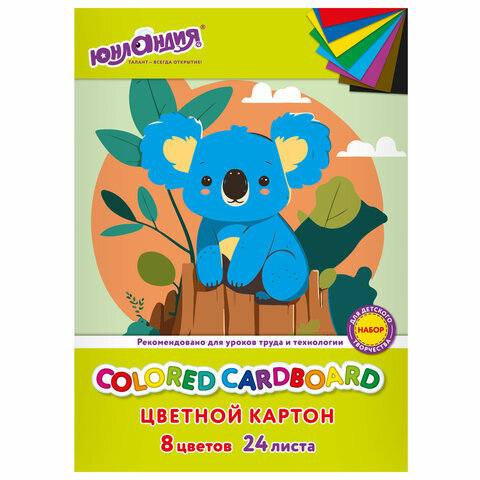 Картон цветной А4 немелованный, 24 листов, 8 цветов, в папке, ЮНЛАНДИЯ, 200х290 мм, "Коала", 115640