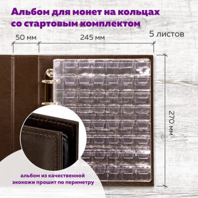 Альбом нумизмата из экокожи для монет и купюр OPTIMA, 245х270 мм, со стартовым комплектом, STAFF, 238075