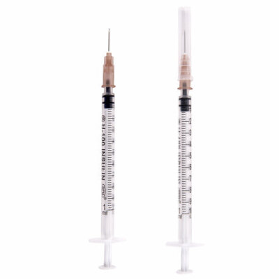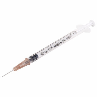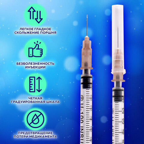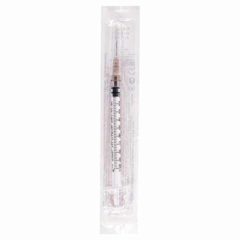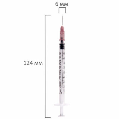 Трехкомпонентный одноразовый шприц состоит из трех частей: цилиндр, поршень, манжета на поршне, изготовлен из специального полипропилена. Нетоксичен, апирогенен. Объем – 1 мл, игла съемная, размер иглы – 26G. Шкала – U-100.