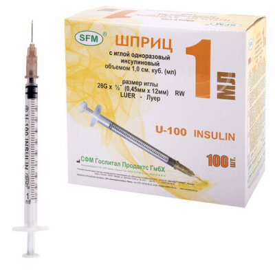 Шприц инсулиновый SFM, 1 мл, КОМПЛЕКТ 100 шт., в коробке, U-100 игла 0,45х12 мм - 26G, 534208