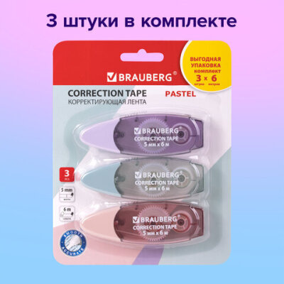 Корректирующая лента BRAUBERG PASTEL, 5 мм х 6 м, ВЫГОДНАЯ УПАКОВКА 3 штуки в блистере, 272658