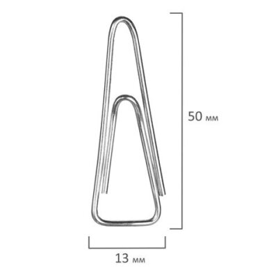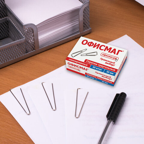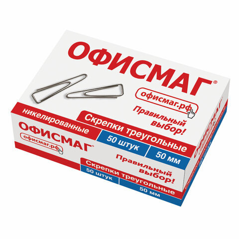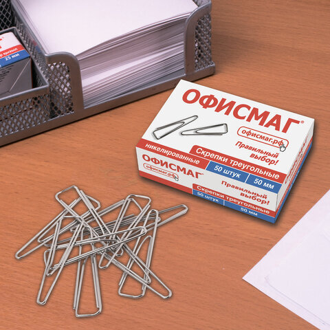 Скрепки большие 50 мм, ОФИСМАГ, никелированные, треугольные, 50 шт., в картонной коробке, 222093