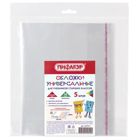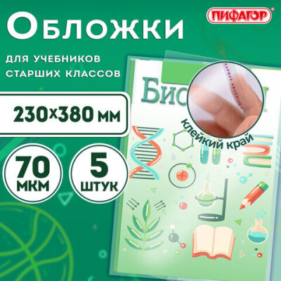 Обложки ПП для учебников старших классов МАЛОГО ФОРМАТА, КОМПЛЕКТ 5 шт., КЛЕЙКИЙ КРАЙ, 70 мкм, 230х380 мм, прозрачные, ПИФАГОР, 227411