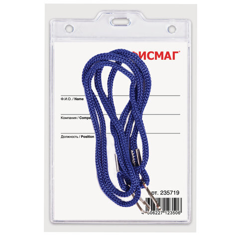 Бейдж вертикальный БОЛЬШОЙ (120х90 мм), на синем шнурке 45 см, 2 карабина, ОФИСМАГ, 235719