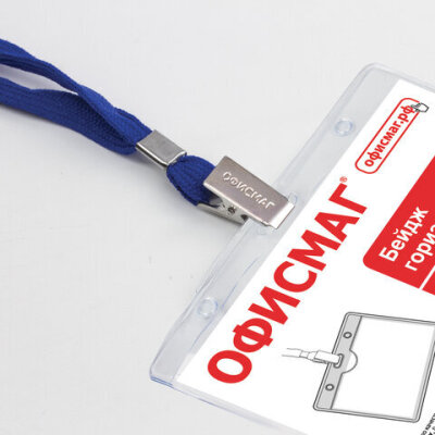 Бейдж горизонтальный (60х90 мм), на синей ленте 45 см, ОФИСМАГ, 235703