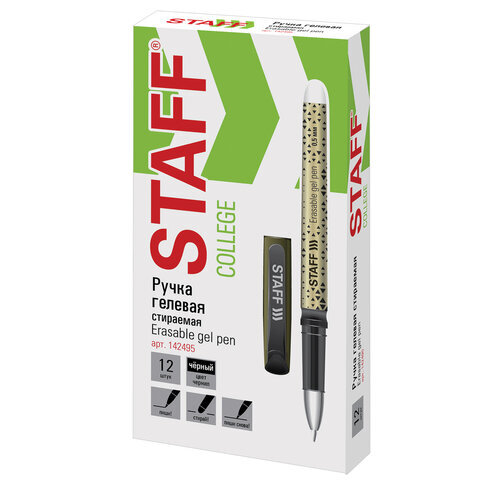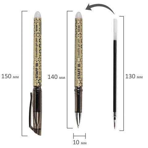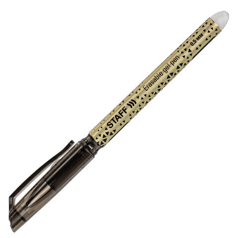 Стираемая ручка STAFF пишет специальными гелевыми чернилами, которые становятся невидимыми при нагревании до 60 °С и выше. Нагрев достигается ластиком, встроенным в корпус ручки. Написанное можно восстановить при температуре ниже –18 °С.