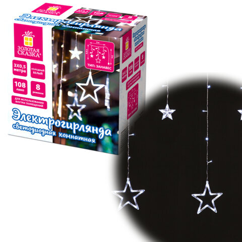 Электрогирлянда-занавес комнатная "Звезды" 3х0,5 м, 108 LED, холодный белый, 220 V, ЗОЛОТАЯ СКАЗКА, 591355