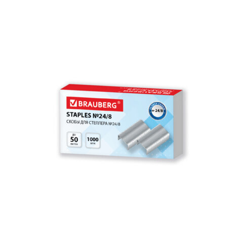 Заточенные скобы для степлера BRAUBERG размером №24/8 обеспечивают сшивание до 50 листов.