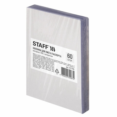 Обложка для листа паспорта КОМПЛЕКТ 60 штук, ПВХ, прозрачная, STAFF, 237596