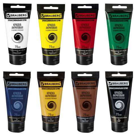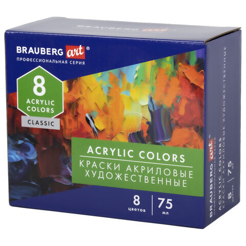 Краски акриловые художественные глянцевые 8 цветов в тубах по 75 мл, BRAUBERG ART CLASSIC, 192425