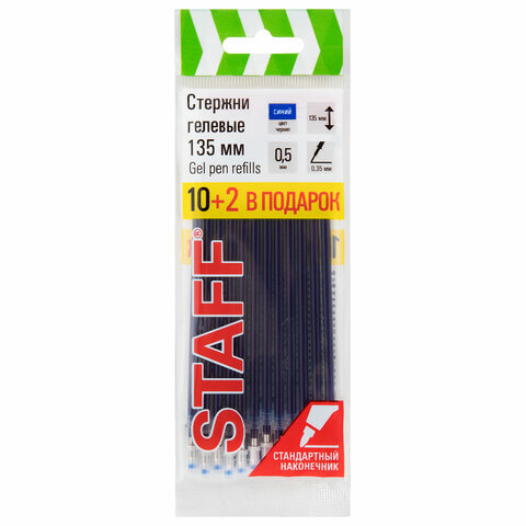 Стержни гелевые STAFF, 135 мм, НАБОР 10 шт. + 2 шт. в ПОДАРОК, СИНИЕ, стандартный узел 0,5 мм, линия письма 0,35 мм, 170410