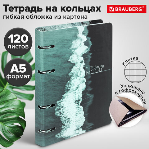 Тетрадь на кольцах А5 160х212 мм, 120 листов, картон, матовая ламинация, клетка, BRAUBERG, "Relax", 404725