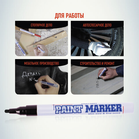 Маркер-краска пишет по любому типу поверхности: бумаге, дереву, пластику, металлу, натуральному и искусственному камню, стеклу. Маркер морозоустойчив, не выгорает на солнце, может писать по горячей (до 130 градусов) или загрязненной поверхности.