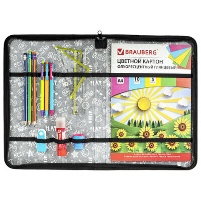 • Папка на молнии BRAUBERG с ручкой и органайзером. Внутри папки - крепления для канцелярских и письменных принадлежностей. Застежка-молния расположена по периметру папки.