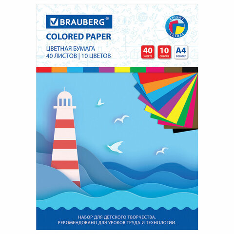 Цветная бумага А4 офсетная, 40 листов 10 цветов, в папке, BRAUBERG, 200х280 мм, "Море", 115169