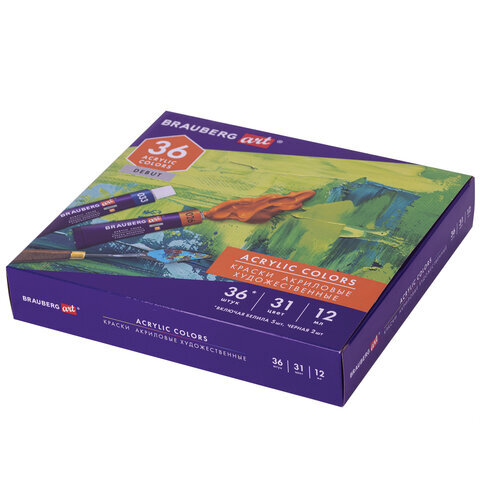 Краски акриловые художественные НАБОР 36 штук, 31 цвет по 12 мл в тубах, BRAUBERG ART DEBUT, 192294