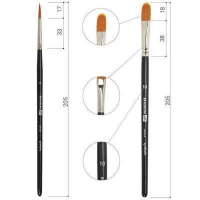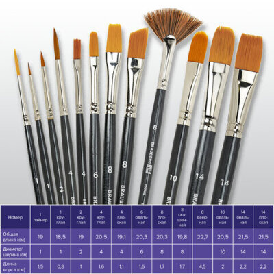 | Номер кисти | круглая № 1, 2, 4; плоская № 4, 8, 14; скошенная № 8; овальная № 6, 10, 14; веерная № 8; лайнер № 1 |