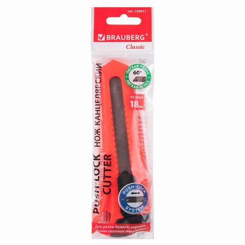 Нож канцелярский 18 мм BRAUBERG "Classic", фиксатор, корпус ассорти, упаковка с европодвесом, 230917