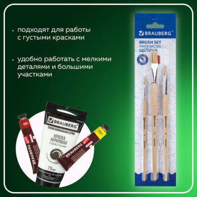 Набор из трех кистей разного размера BRAUBERG позволяет начинающим художникам решать любые творческие задачи в детском саду, школе и дома.