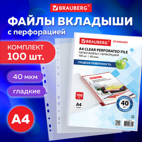 Папки-файлы перфорированные А4 BRAUBERG "STANDARD", КОМПЛЕКТ 100 шт., гладкие, 40 мкм, 229661