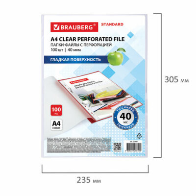 Перфорированные папки-файлы BRAUBERG "STANDARD" предназначены для хранения документов в папке с любым кольцевым механизмом или скоросшивателем.