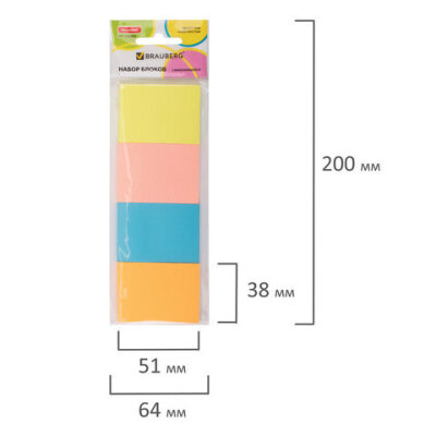 Блок самоклеящийся (стикеры), BRAUBERG, НЕОНОВЫЙ, 38х51 мм, 4 цвета х 50 листов, 124807
