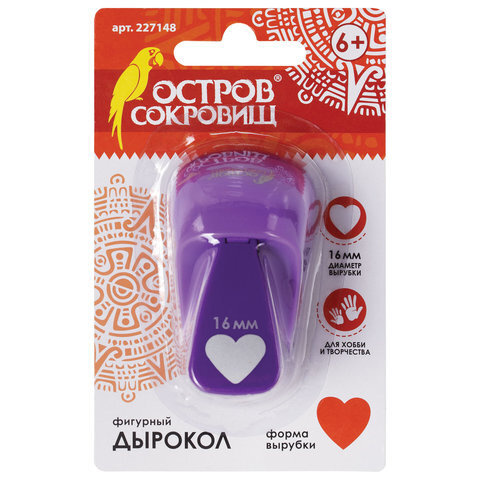 Дырокол фигурный "Сердце", диаметр вырезной фигуры 16 мм, ОСТРОВ СОКРОВИЩ, 227148