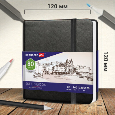 Скетчбук, слоновая кость 140 г/м2 120х120 мм, 80 л., КОЖЗАМ, резинка, BRAUBERG ART CLASSIC, черный, 113191