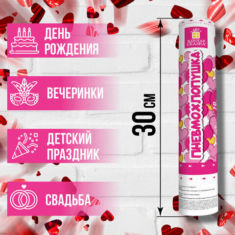 Пневматическая хлопушка ЗОЛОТАЯ СКАЗКА предназначена для создания отличного настроения и атмосферы настоящего веселья на любом празднике - свадьбе, новогодней вечеринке, торжестве в честь Дня Рождения, корпоративе или любом другом праздничном событии.