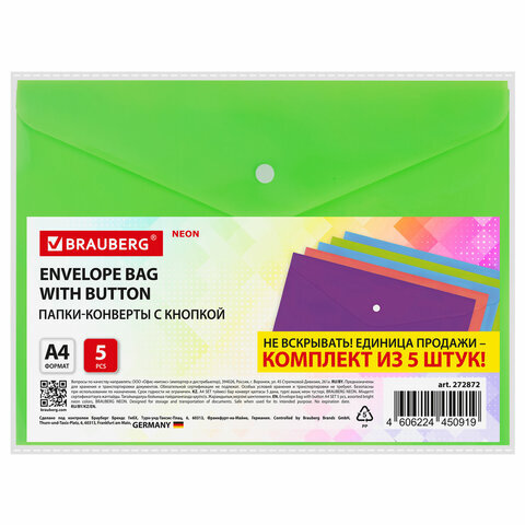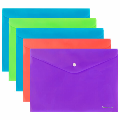 Папка-конверт с кнопкой А4, КОМПЛЕКТ 5 шт., яркие неоновые цвета ассорти, BRAUBERG "NEON", 272872