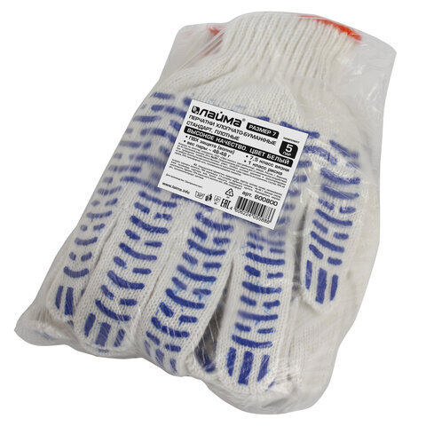 Перчатки хлопчатобумажные, КОМПЛЕКТ 5 ПАР, 7,5 класс, 46-48 г, 166 текс, ПВХ волна, LAIMA "СТАНДАРТ", БЕЛЫЕ, 600800