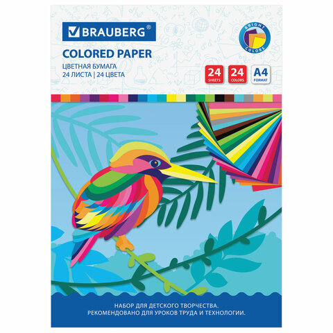 Цветная бумага А4 офсетная, 24 листа 24 цвета, на скобе, BRAUBERG, 200х280 мм, "Птица", 113538