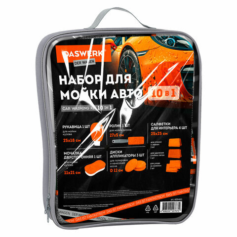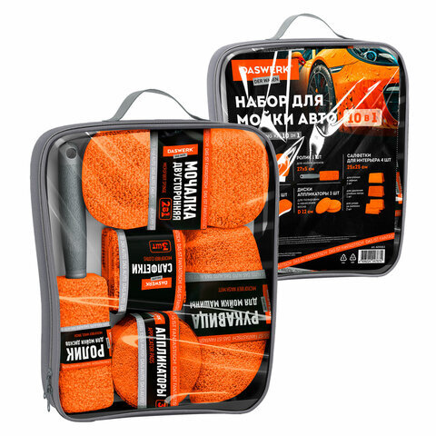 Набор для мойки авто 10 в 1, оранжевый, СУМКА ДЛЯ ХРАНЕНИЯ В КОМПЛЕКТЕ, DASWERK (ДАСВЕРК), 609483